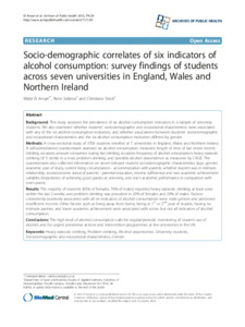 El Ansari, Walid, Sebena, Rene and Stock, Christiane (2013) Socio-demographic correlates of six indicators of alcohol consumption: survey findings of students across seven universities in England, Wales and Northern Ireland. Archives of Public Health, 71 (1). p. 29.