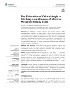 Purpose. Sport climbing is a technical, self-paced sport and the workload is highly variable and mainly localized to the forearm flexors. It has not proved effective to control intensity using measures typical of other sports, such as gas exchange thresholds, heart rate or blood lactate. Therefore, the purposes of the study were to 1) determine the possibility of applying the mathematical model of critical power to the estimation of a critical angle (CA) as a measure of maximal metabolic steady state in climbing, and 2) to compare this intensity with the muscle oxygenation breakpoint (MOB) determined during an exhaustive climbing task. Materials and Methods. Twenty-seven sport climbers undertook three to five exhaustive ascents on a motorized treadwall at differing angles to estimate CA, and one exhaustive climbing test with a progressive increase in angle to determine MOB, assessed using near infrared spectroscopy. Results. Model fit for estimated CA was very high (R2=0.99; SEE=1.1°). The mean peak-angle during incremental test was -17±5° and CA from exhaustive trials was found at -2.5±3.8°. Nine climbers performing the ascent 2° under CA were able to sustain the task for 20 min with perceived exertion at 12.1±1.9 (RPE). However, climbing 2° above CA led to task failure after 15.9±3.0 min with RPE=16.4±1.9. When MOB was plotted against estimated CA, good agreement was stated (ICC=0.80, SEM=1.5°). Conclusion. Climbers, coaches and researchers may use a predefined route with three to five different wall angles to estimate CA as an analogue of critical power to determine a maximal metabolic steady state in climbing. Moreover, a climbing test with progressive increases in wall angle using MOB also appears to provide a valid estimate of CA.
