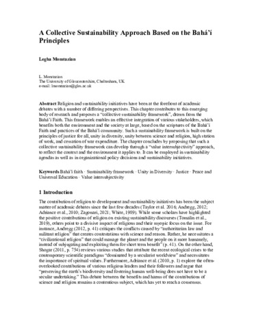 Religion and sustainability initiatives have been at the forefront of academic debates with a number of differing perspectives. This chapter contributes to this emerging body of research and proposes a “collective sustainability framework”, drawn from the Bahá’í Faith. This framework enables an effective integration of various stakeholders, which benefits both the environment and the society at large, based on the scriptures of the Bahá’í Faith and practices of the Bahá’í community. Such a sustainability framework is built on the principles of justice for all, unity in diversity, unity between science and religion, high station of work, and cessation of war expenditure. The chapter concludes by proposing that such a collective sustainability framework can develop through a “value intersubjectivity” approach, to reflect the context and the environment it applies to. It can be employed in sustainability agendas as well as in organizational policy decisions and sustainability initiatives.