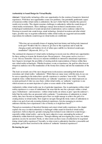 Virtual reality technology offers new opportunities for the creation of immersive historical experiences. With these new opportunities comes new problems. One potentially problematic aspect of immersion within virtual reality is authenticity: the user’s belief that the virtuality they perceive would exist in reality. This chapter examines challenges to authenticity within the sound design of virtual reality environments. These challenges emerge from technical considerations such as technological mediatisation of sound and practical considerations such as audience subjectivity. Drawing on research into sound design, sound technology, historical recreation and other related topics, possible ways to negotiate authenticity within virtual reality are suggested and reasonable expectations for authentic sound design in virtual reality are established.