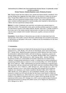 Aim Physical abuse has been linked to poor mental and physical health in adulthood, more recently findings have suggested that these effects can be present in children as young as three. Though these effects are known, research exploring interventions specifically for children who have experienced physical abuse is scarce. The current systematic review uses a narrative synthesis approach to examine studies which reported on interventions for children who have experienced physical abuse. Method A number of databases were searched, and studies were selected based on hierarchical criteria. This systematic review used a narrative synthesis approach to evaluate the interventions involved in the studies selected. Results: There were 17 studies included in this review, each of the studies reported improvements in at least one of the necessary outcome areas evaluated which included: behavioural, cognitive, and socio-emotional outcomes. Conclusion Overall efficacy of interventions was not able to be determined due to the heterogeneity of the studies, however theoretical underpinnings and successful components of interventions are discussed in this review. Limitations and recommendations for the future are also addressed.