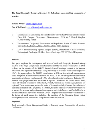 14233 Morse, A. and Robinson, G. M. (2024) The Rural Geography Research Group at 50 Reflections on an evolving community of practice.pdf - Accepted Version Available under License Creative Commons Attribution Non-commercial No Derivatives 4.0. Download (652kB) | Preview |
