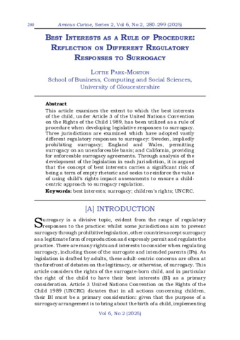 14594 Park-Morton, Lottie (2024) Best interests as a rule of procedure Reflection on different regulatory responses to surrogacy.pdf - Accepted Version Available under License Creative Commons Attribution Non-commercial No Derivatives 4.0. Download (184kB) | Preview |