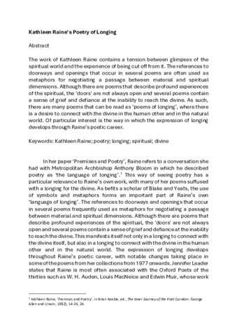 The work of Kathleen Raine contains a tension between glimpses of the spiritual world and the experience of being cut off from it. The references to doorways and openings that occur in several poems are often used as metaphors for negotiating a passage between material and spiritual dimensions. Although there are poems that describe profound experiences of the spiritual, the 'doors' are not always open and several poems contain a sense of grief and defiance at the inability to reach the divine. As such, there are many poems that can be read as ‘poems of longing’, where there is a desire to connect with the divine in the human other and in the natural world. Of particular interest is the way in which the expression of longing develops through Raine’s poetic career.