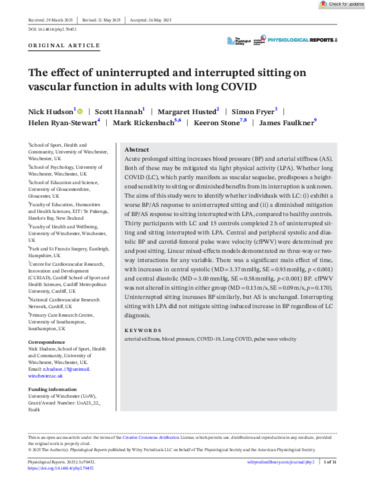 Hudson, Nick, Scott, Hannah, Husted, Margaret, Fryer, Simon M ORCID logoORCID: https://orcid.org/0000-0003-0376-0104, Ryan-Stewart, Helen, Rickenbach, Mark and Faulkner, James (2025) The effect of uninterrupted and interrupted sitting on vascular function in adults with Long COVID. Physiological Reports, 13 (19). e70452. doi:10.14814/phy2.70452