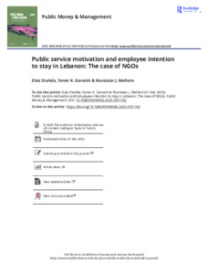 15166 Shahda, E., et al (2025) Public service motivation and employee intention to stay in Lebanon - The case of NGOs.pdf - Accepted Version Restricted to Repository staff only until 8 January 2027. (Publisher Embargo). Available under License Creative Commons Attribution Non-commercial No Derivatives 4.0. Download (445kB) |