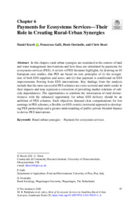 In this chapter, rural-urban synergies are examined in the context of land and water management interventions and how these are stimulated by payments for ecosystems services (PES). A review of PES literature highlights, by drawing on 10 European case studies, that PES are based on core principles of (i) the recognition of both ESS suppliers and users; and (ii) that payment is conditional on ESS improvements flowing from ESS interventions. Key findings from the analysis include that the most successful PES schemes are cross-sectoral and multi-scalar in their impacts and may represent a correction of prevailing market relations of subsidy dependencies. The opportunities to combine the valorisation of rural distinctiveness with the enhanced opportunity for urban ESS delivery should be an ambition of PES schemes. Such objectives demand clear compensations for lost earnings in PES schemes, a flexible (or ESS-centric) territorial approach to developing PES partnerships and a greater understanding of public-private blended finance to devise PES innovations.