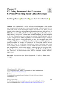 This chapter offers a review of eight selected European Union policies and strategies which, to a greater or lesser extent, engage with ecosystem services (ESS). The review reveals three types of policy reference to ESS. Some policies include explicit objectives and mechanisms designed to underpin different types of ESS; others mention ESS explicitly but without suggesting specific policy actions. Lastly, implicit mentions of ESS functions also appear without any direct mention of the term. Our analysis seeks to examine the extent to which EU policies with an explicit or implicit focus on ESS might better secure rural urban synergies. Findings suggest that EU policies which focus on ESS are more likely to support rural-urban synergies if they have eco-social objectives, for example sustainable agriculture or rural development, as outlined for example in the Farm2Fork Strategy and the Long-Term Vision for Rural Areas. Such policies foresee functioning rural-urban links including producer-consumer relations and the economic interaction of rural and urban dwellers. Policies more narrowly concerned with the biological functioning of ecosystems, such as the Soil Strategy or the Biodiversity Strategy are less synergistic, not least because their arena of operation remains predominantly rural.