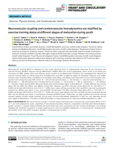 Neurovascular coupling and cerebrovascular hemodynamics are modified by exercise training status at different stages of maturation during youth.