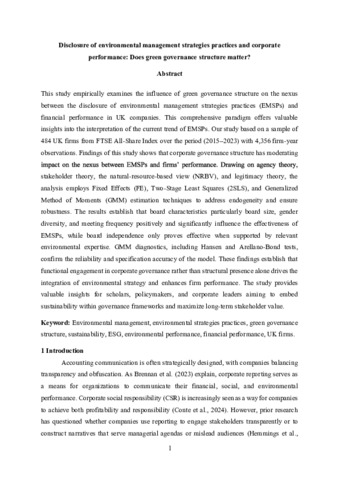 15564 Angsoyiri, D et al. (2025) Disclosure of environmental management strategies practices and corporate performance.pdf - Accepted Version Available under License Creative Commons Attribution Non-commercial 4.0. Download (1MB) | Preview |