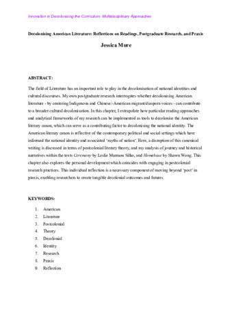 The field of Literature has an important role to play in the decolonisation of national identities and cultural discourses. The author’s own postgraduate research interrogates whether decolonising American literature, by centring Indigenous and Chinese/American migrant/diaspora voices, can contribute to a broader cultural decolonisation. In this chapter, the author extrapolates how particular reading approaches and analytical frameworks of the author’s research can be implemented as tools to decolonise the American literary canon, which can serve as a contributing factor to decolonising the national identity. The American literary canon is reflective of the contemporary political and social settings that have informed the national identity and associated ‘myths of nation’. Here, a disruption of this canonical writing is discussed in terms of postcolonial literary theory and the author’s analysis of journey and historical narratives within the texts Ceremony by Leslie Marmon Silko and Homebase by Shawn Wong. This chapter also explores the personal development that coincides with engaging in postcolonial research practices. This individual reflection is a necessary component of moving beyond ‘post’ in praxis, enabling researchers to create tangible decolonial outcomes and futures.