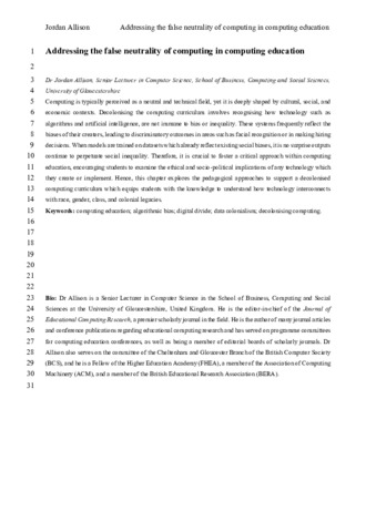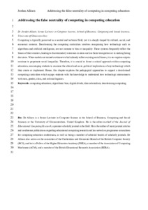 15569 Allison, J (2025) Addressing the false neutrality of computing in computing education.pdf - Accepted Version Available under License All Rights Reserved. Download (270kB) | Preview |