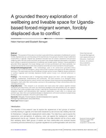 A grounded theory exploration of wellbeing and liveable space for Uganda-based forced migrant women, forcibly displaced due to conflict.