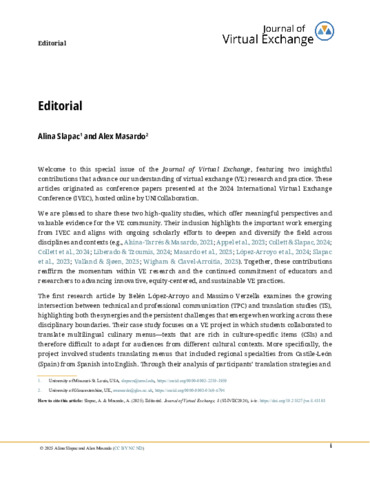 This editorial introduces a Special Issue of the Journal of Virtual Exchange featuring two research articles originally presented at the 2024 International Virtual Exchange Conference (IVEC). The contributions highlight current advances in virtual exchange (VE) research with a focus on interdisciplinary collaboration and sustainability. The first article examines a VE between technical and professional communication and translation studies students engaged in translating culturally embedded culinary texts, demonstrating how VE environments support negotiation of meaning, audience awareness, and the development of professional competencies. The second article addresses the issue of VE sustainability by applying an implementation science lens to long-standing exchanges, revealing how facilitators balance fidelity to core objectives with purposeful adaptation across iterations. Together, these studies underscore VE’s potential to foster authentic, multilingual, and equity-centered learning while emphasizing the importance of adaptable and sustainable design. The editorial situates these contributions within broader conversations shaping the field and invites continued scholarly engagement with VE research and practice.