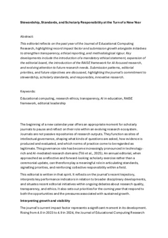 Allison, Jordan ORCID logoORCID: https://orcid.org/0000-0001-8513-4646 (2026) Stewardship, Standards, and Scholarly Responsibility at the Turn of a New Year. Journal of Educational Computing Research. doi:10.1177/07356331261416746 (In Press)