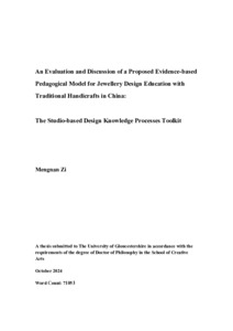 Zi, Mengnan (2024) An Evaluation and Discussion of a Proposed Evidence-based Pedagogical Model for Jewellery Design Education with Traditional Handicrafts in China: The Studio-based Design Knowledge Processes Toolkit. Doctoral thesis, University of Gloucestershire. doi:10.46289/OKER3618