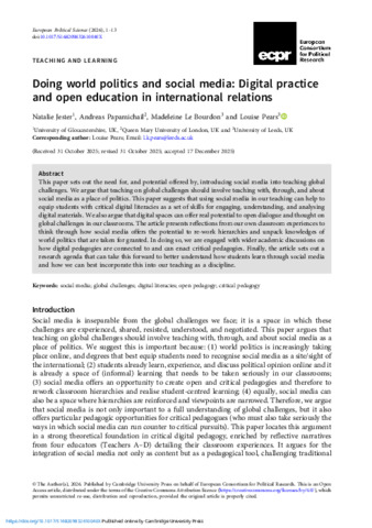 Jester, Natalie ORCID logoORCID: https://orcid.org/0000-0002-7995-3028, Papamichail, Andreas, Le Bourdon, Madeleine and Pears, Louise (2026) Doing world politics and social media: digital practice and open education in International Relations. European Political Science. doi:10.1017/S168209832610040X (In Press)