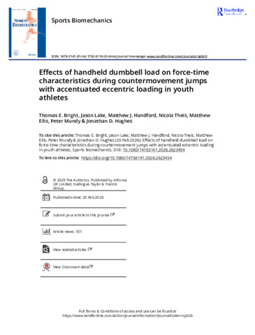 Bright, Thomas E. ORCID logoORCID: https://orcid.org/0000-0001-8089-817X, Lake, Jason ORCID logoORCID: https://orcid.org/0000-0003-4381-0938, Handford, Matthew J. ORCID logoORCID: https://orcid.org/0000-0002-4897-8396, Theis, Nicola ORCID logoORCID: https://orcid.org/0000-0002-0775-1355, Ellis, Matthew, Mundy, Peter ORCID logoORCID: https://orcid.org/0000-0003-1478-3774 and Hughes, Jonathan D. ORCID logoORCID: https://orcid.org/0000-0002-9905-8055 (2026) Effects of handheld dumbbell load on force-time characteristics during countermovement jumps with accentuated eccentric loading in youth athletes. Sports Biomechanics. pp. 1-20. doi:10.1080/14763141.2026.2623454 (In Press)