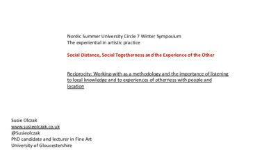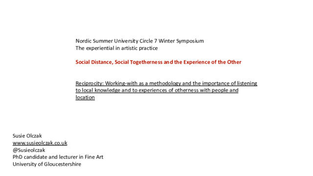 Inspired by the idea of healthy ecosystems, as systems in which a multiplicity of beings and different ways of doing find interesting things to do together, participants explored these ideas through artistic research. This symposium emphasised working-with as a methodology, echoing what would occur in a sustainable and robust ecosystem. In Latvia Olczak presented examples of practice-based research undertaken addressing experiences of rural-urban spatial dynamics and the hybridity of physical and digital worlds. The works explore ideas of time, fragility and spatial experience through consideration of the cosmological and the geological. In Stockholm Olczak presented the methodologies employed in two collaborations involving the use of time-based media.