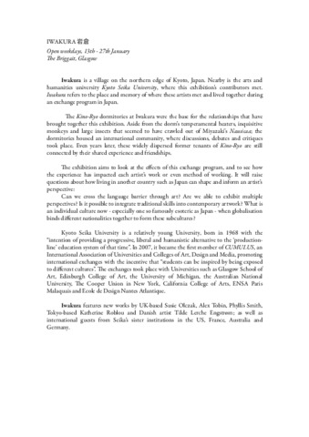 IWAKURA 岩倉 was an exhibition at The Briggait, Glasgow. Iwakura was a village on the northern edge of Kyoto, Japan. Nearby was the arts and humanities university Kyoto Seika University, where the exhibition’s contributors had met. Iwakura referred to the place and memory of where these artists met and lived together during an exchange programme in Japan. The exhibition aimed to look at the effects of this exchange programme, and to consider how the experience had impacted each artist’s work or even method of working. It raised questions about how living in another country such as Japan could shape and inform an artist’s perspective: whether language barriers could be crossed through art; whether multiple perspectives could be exhibited; whether traditional skills could be integrated into contemporary artwork; and what constituted an individual culture - especially one so often described as esoteric as Japan - when globalisation bound different nationalities together to form subcultures. The exchanges took place with institutions such as Glasgow School of Art, Edinburgh College of Art, University of Michigan, Australian National University, The Cooper Union, California College of the Arts, ENSA Paris-Malaquais and Ecole de Design Nantes Atlantique. Iwakura featured new works by UK-based Susie Olczak, Alex Tobin, Phyllis Smith, Tokyo-based Katherine Roblou and Danish artist Tilde Lerche Engstrøm, as well as international guests from Seika’s sister institutions in the United States, France, Australia and Germany.