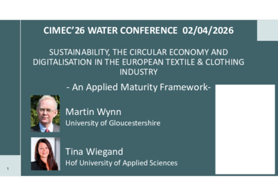 Wynn, Martin G ORCID logoORCID: https://orcid.org/0000-0001-7619-6079 and Wiegand, Tina (2026) Sustainability, the circular economy and digitalisation in the European textile and clothing industry: an Applied Maturity Framework. In: CIMEC’26 Water Conference: Rethinking Water through Science, Economics, Law, and Society, April 1st - 3rd, 2026, Dakhla, Morocco. (Unpublished)