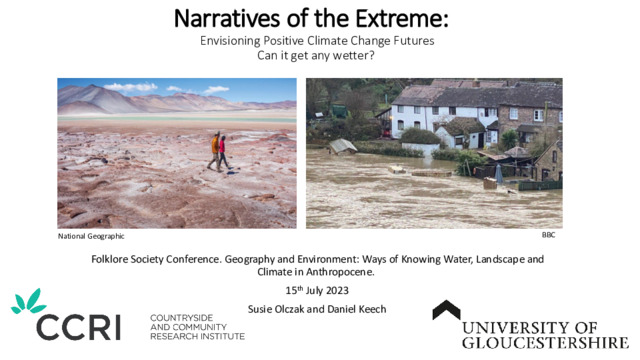 Daniel Keech, Senior Research Fellow Countryside and Community Research Institute, University of Gloucestershire and Susie Olczak, Lecturer in Fine Art, University of Gloucestershire Narratives of the extreme – can it get any wetter? Populations in the Panamanian jungle and the Somerset Levels and Moors have, for centuries, planned their lives around living with water. In Somerset, year-round farming is possible thanks to a network of hi-tech sluices and ancient rhynes that drain what was, essentially, marshy wilderness. Panama’s isolated Darien National Park experiences 330 days of rain a year. In our presentation, we examine (beyond the reality of living with water, which in these regions is routine), what happens when the extreme gets wetter. A decade ago, consecutive floods in Somerset caused three months of inundation, leading to physical and social upheaval not experienced for a generation. In Panama the already wet climate is getting wetter. Our different methodological approaches as artist and geographer are united by interest in the idea that climate change is challenging people who live with extremes of water, to cope with more. On one hand, this raises alarms about the urgency of climate change. On the other, people are discussing hopeful and adaptive local futures, too often crowded out by policy and scientific narratives.